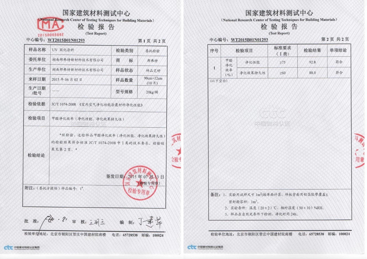 邦弗特UV除醛系列涂料可以有效地分解空氣中及家具本身所釋放的甲醛,凈化效率高、效果持久;經過國家建筑材料測試中心檢測:凈化效率達92.8%,凈化持久效果達到88.0%。