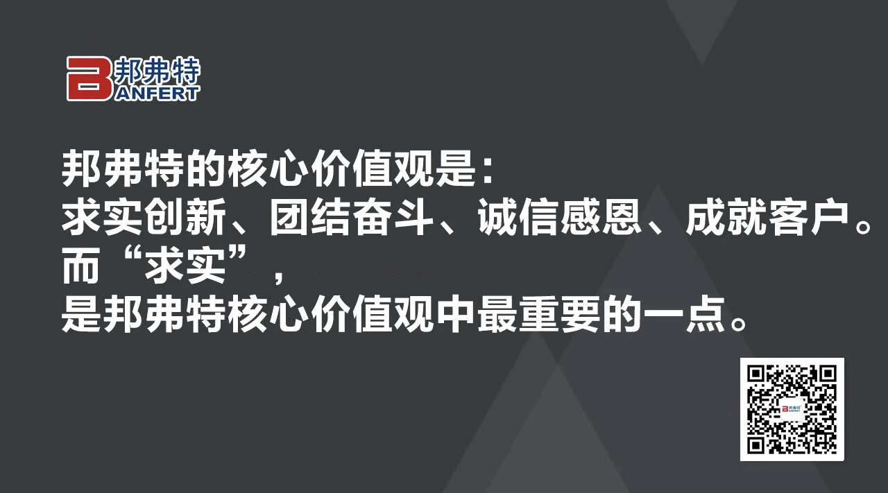 邦弗特的核心價值觀是:求實創新、團結奮斗、誠信感恩、成就客戶。而“求實”,是邦弗特核心價值觀中最重要的一點。