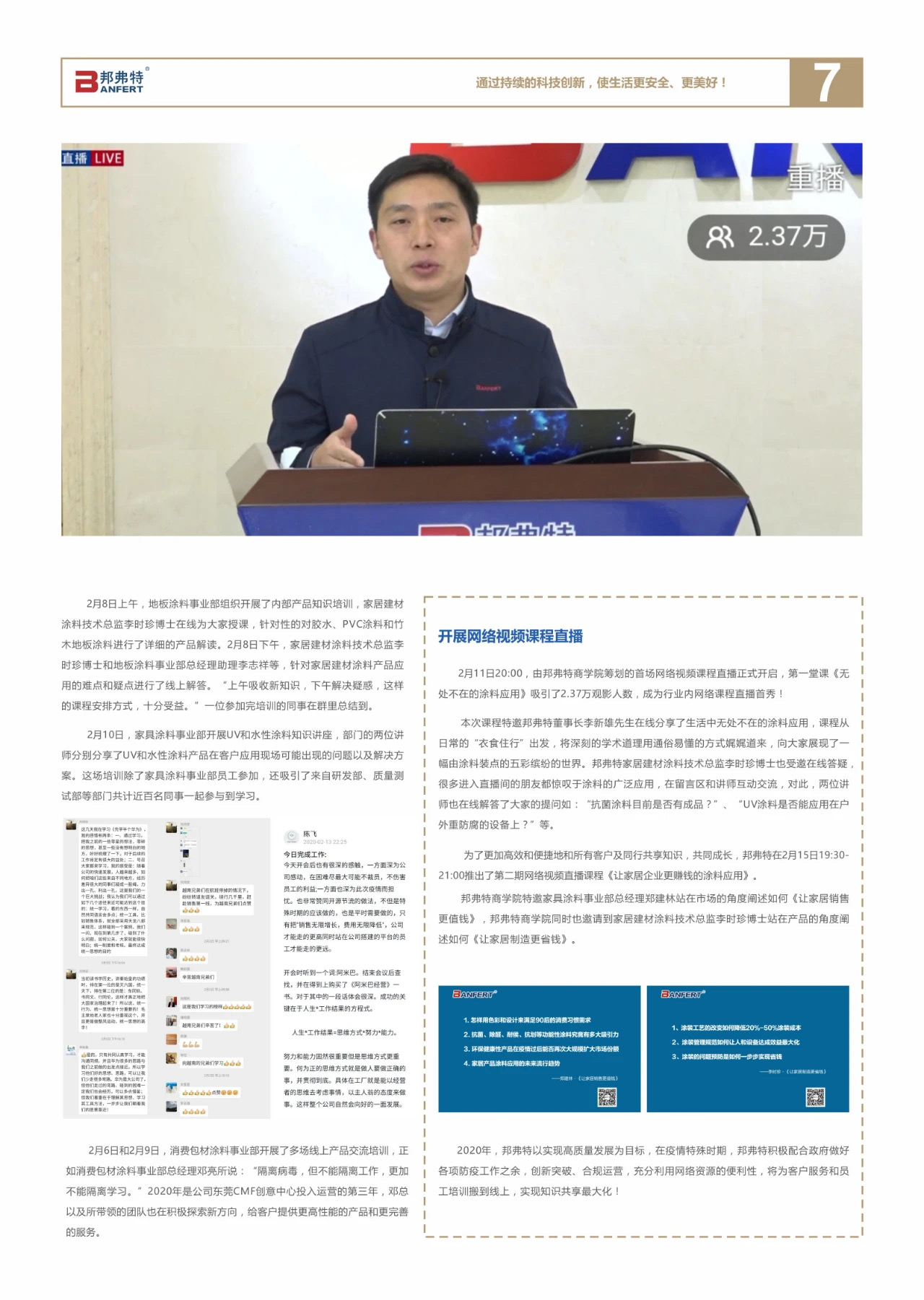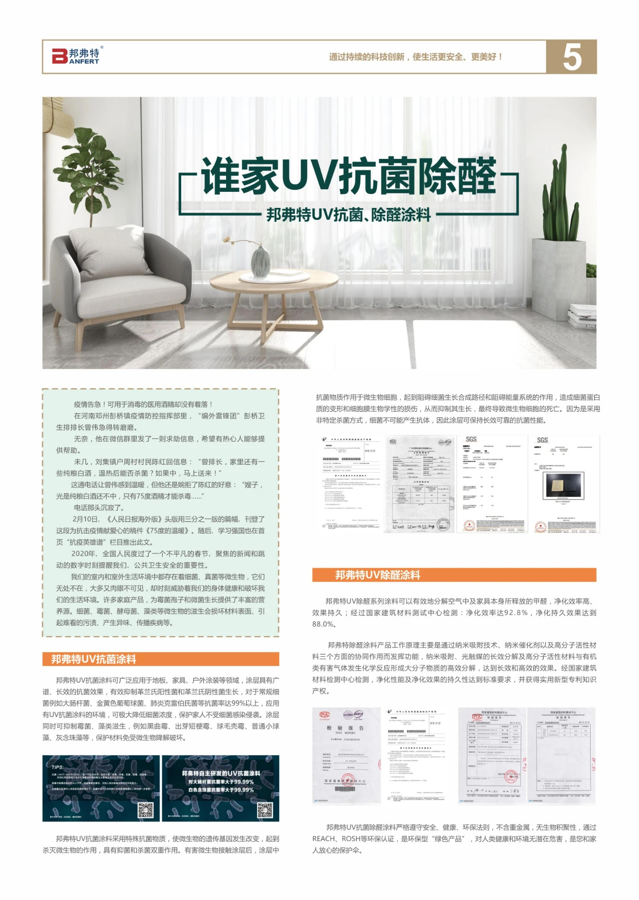 在2020年這個不平凡的春天,邦弗特再啟新征程,開展行業直播首秀,研發升級UV抗菌除醛涂料,超億元戰投資本賦能邦弗特發展,用愛心和行動致敬逆行者。