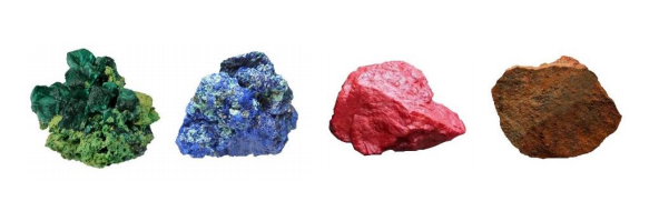 從左至右:孔雀石(石綠)、藍銅礦(石青)、朱砂、赭石