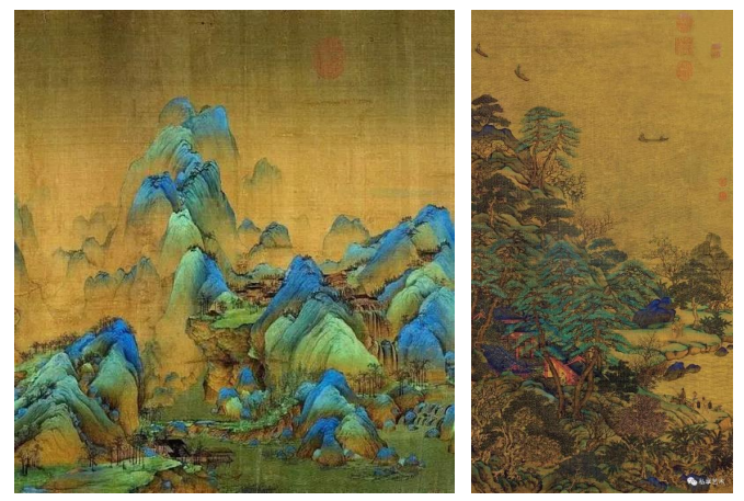 宋·王希孟《千里江山圖》局部/唐·李思訓《江帆樓閣圖》