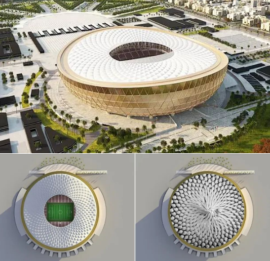 中國鐵建國際集團承建的盧賽爾體育場(Lusail Stadium)是卡塔爾世界杯決賽的主體育場。盧賽爾體育場球場外觀以椰棗碗和琺瑯燈籠為設計靈感,頂部膜系統(tǒng)紋樣是斐波那契數列圖類型,是現(xiàn)實與夢幻的設計建造典范。