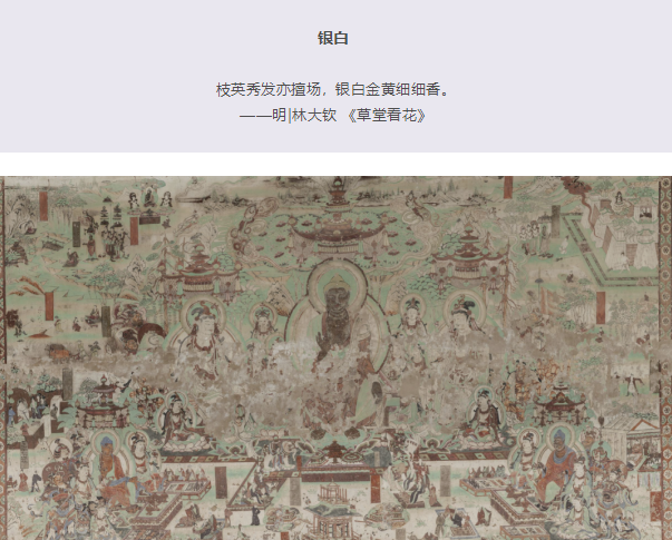 銀白:其色發瑩白。繪畫中使用的銀白是用云母制成的,唐朝繪畫使用云母色,畫好后在八成干時用干凈的薄布輕輕擦之,將浮色擦去,其色才有光澤。