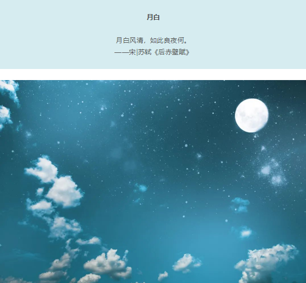 月白:屬于自然的色彩,形容皎潔純凈良夜下、月亮高掛朗照的顏色。