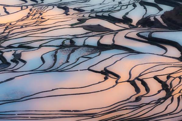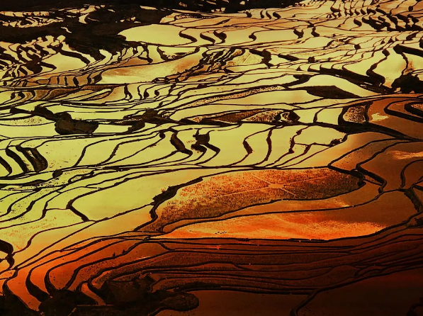 充滿生機(jī)的晨曦色被輕霧繚繞,流霧攜著曦色追隨陽光貼著梯田水面緩行,在村巷屋舍間游走,慢慢兒彌漫了山谷溝壑,不經(jīng)意間浸潤(rùn)了每個(gè)早出人的身心,讓世間的所有,在晨曦赬霞的裹挾下顯得如此明媚溫暖。