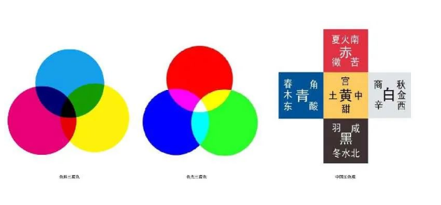 中國五色觀:中國古人從日月晨昏、四季更替、斗轉星移動的自然現象中確立“青、赤、黃、白、黑”五色為萬物本源之色。五行論認為世界由木、火、土、金、水這五種原初物質組成,五色與五行、方位、時間等對應被賦予了陰陽調和、萬物共生、中庸和諧等豐富的哲學思想與文化內涵,是古人對世界起源的追問和總結,深遠影響中國生產生活幾千年。