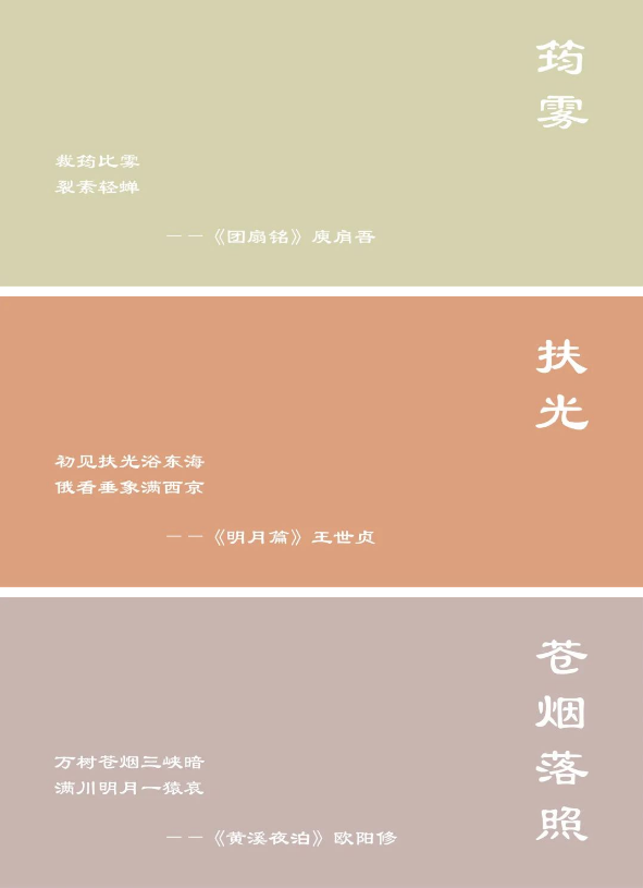中國傳統五色“青赤黃白黑”與五星“歲星、熒惑星、填星、太白星、辰星”一一對應,直接反映了中國古代先民對五星聚合天象的崇拜觀念。《中國傳統色:故宮里的色彩美學》中與四時更替、星象意境相關的還有:黃白游、黃埃、纁黃、碧落、春辰、青冥、冥色、煙紅、赪紫、扶光、星郎、明月珰、月魄、溶溶月、品月、蕉月、竹月、淺云、云門、綠云、晴山、雷雨垂、筠霧、出岫、卵色、逍遙游、蒼煙落照、霽藍、暮山紫、赪霞、天水碧、夕嵐、雌霓、蒼蒼等色。
