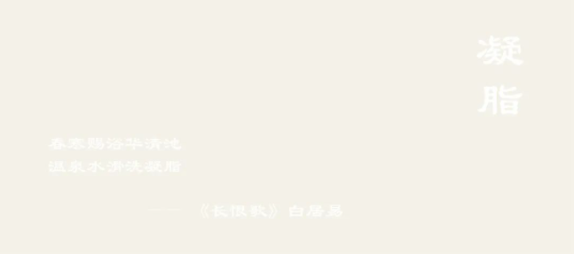 【凝脂】白露之起色,膚如凝脂,《長恨歌》白居易詠“春寒賜浴華清池,溫泉水滑洗凝脂?!?