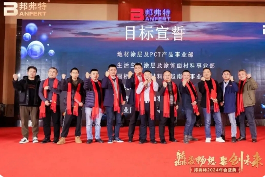 地材涂層與PCT產品事業部、生活空間涂層及涂飾面材料、無機材料涂層事業部、櫥柜涂層及材料(越南)事業部、消費包材涂層事業部、工業防護涂層事業部負責人依次上臺簽署2024年經營目標責任狀,并將進行目標宣誓,展現全體邦弗特人踔厲奮發、勇毅前行的堅定決心。