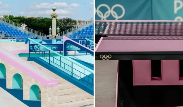 粉色作為巴黎奧運會的輔助色,在比賽各場地和場館的內(nèi)部軟裝與紫色、綠色、藍色主色調(diào)進行搭配:滑板場地、乒乓球場。通過對色彩飽和度的調(diào)節(jié),在視覺上給觀眾以沖擊的同時又不顯得刺眼。