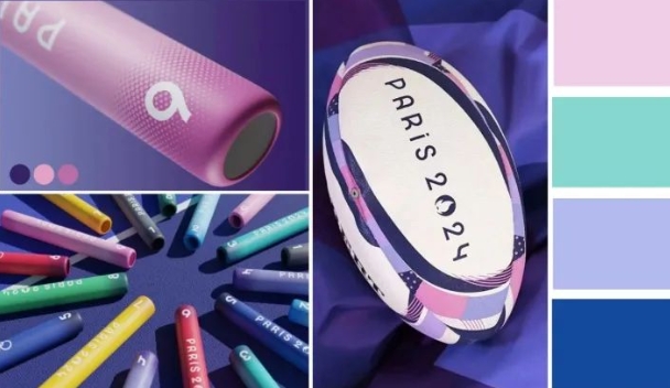 整一套視覺體系也巧妙地融合也應用在賽事用品中:接力棒、排球等。巴黎奧運會的色彩搭配在視覺上呈現(xiàn)出了獨特的法式美學,主要采用了藍、紅、綠、紫四色作為主視覺色彩,這些色彩不僅明亮、柔和且浪漫,還象征了法國多樣性和豐富的文化背景。