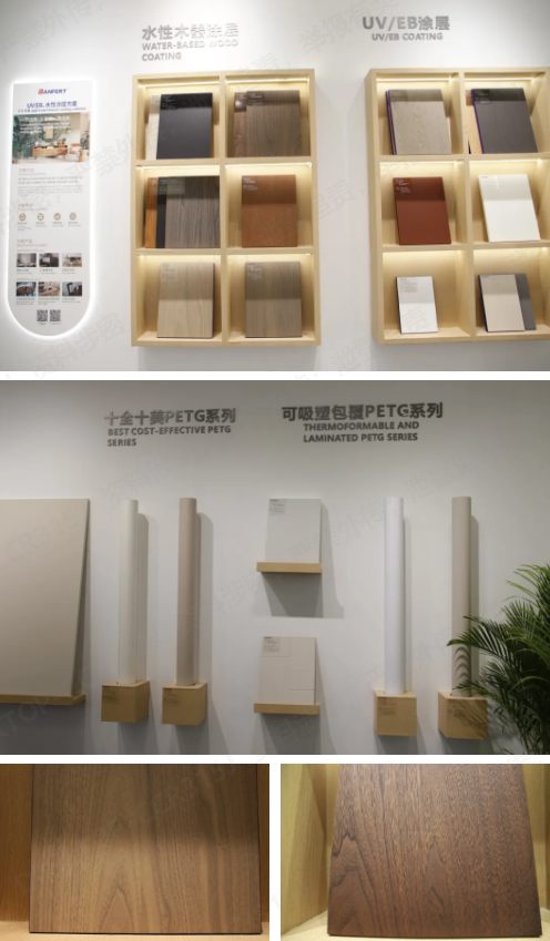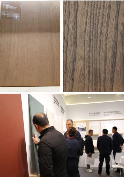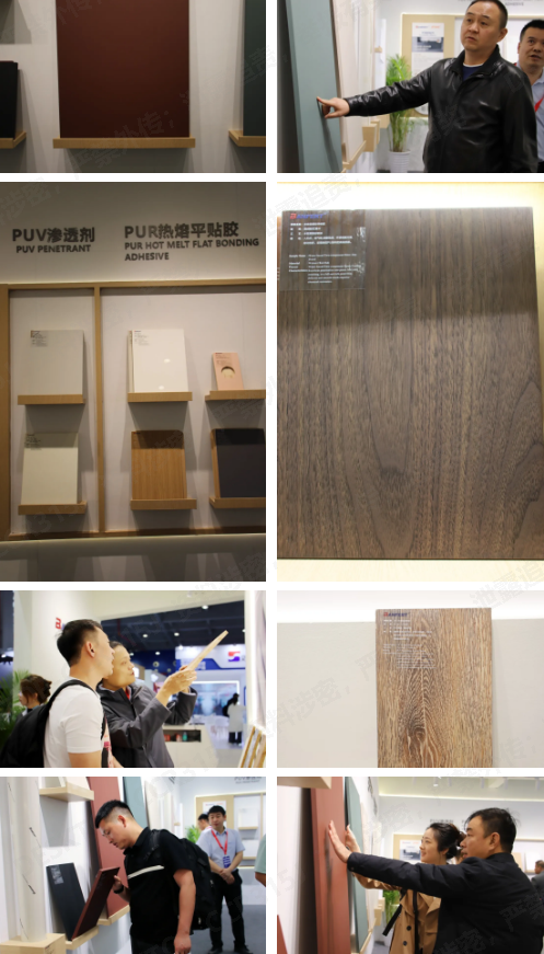 從產品來說,PUR熱熔膠、雙組份聚氨酯膠、水性聚氨酯膠等膠粘劑突破環保技術瓶頸,無醛凈味,性能優越,為板材粘接提供綠色健康解決方案;水性、UV實色混油涂層產品,不僅能實現豐富的色彩,更重要的是無溶劑添加,環保凈味;PETG功能膜材料,相比PVC膜,不僅無味,還可運用于吸塑包覆工藝,實現精美立體造型。