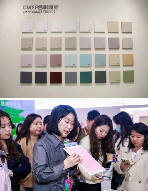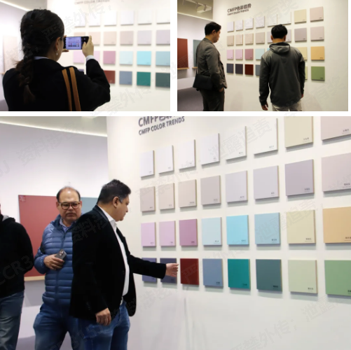 圍繞“色彩”和“紋理”兩大核心方向,邦弗特CMFP創意設計團隊結合飾面材料的材質和工藝,推出板材涂飾材料的色彩趨勢,打造中性、復古為主的整面色彩墻,吸引不少觀眾駐足觀看。