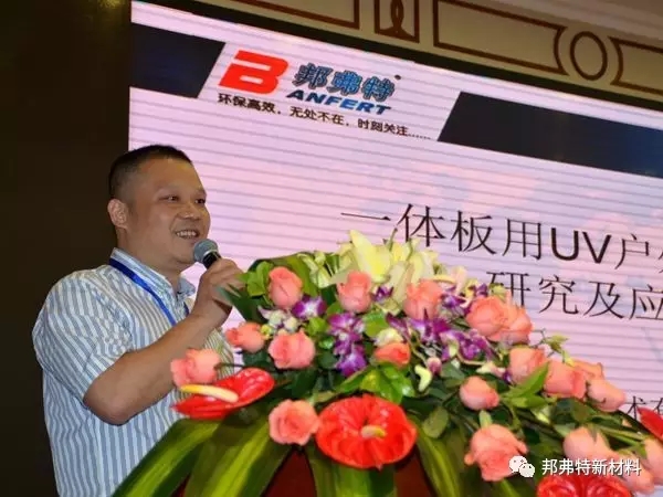 邦弗特應(yīng)邀參加了此次盛會,項目總監(jiān)王林在會議上作了《一體板用UV戶外涂料的研究及應(yīng)用》主題報告。王總分析, 2016年中國外墻保溫市場容量約為7億平方米,其中保溫裝飾一體化板約為6千萬平方米,隨著建筑節(jié)能要求的不斷提高,一體板市場在未來的三至五年內(nèi)將迎來爆發(fā)式增長,環(huán)保高效的UV涂裝解決方案已成為涂裝升級的必然趨勢。
