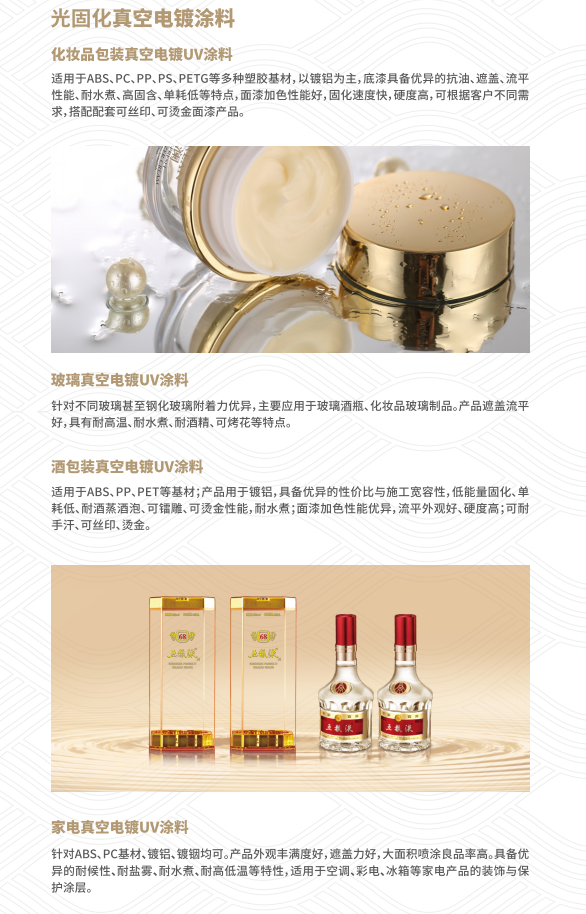 UV真空電鍍涂料是在UV塑膠涂料基礎上發展起來的一種新型紫外光固化涂料。它是利用塑膠基材涂裝底漆后,經真空電鍍或濺涂,涂裝一層金屬薄膜層,再涂覆面漆而成。經過涂裝的塑膠表面,完全閃爍著金屬光澤,顯出高貴和富麗堂皇的金屬品質。塑膠的金屬化裝飾不僅可以節約大量寶貴的金屬材料,也大大減輕了制品質量,近年來獲得了廣泛的認可和應用。其基本涂裝流程如下: